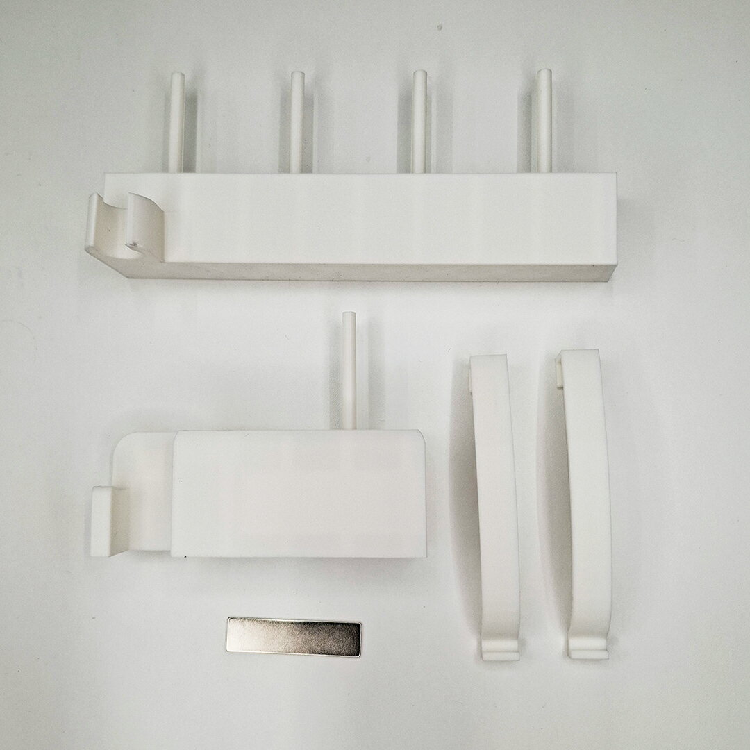 縫製中に外した待ち針をそのまま“ペタッ”と仮置き可能 ■ バックパーツ ・複数色の糸やボビンをまとめて設置 ・よく使う糸を常備しておけば、色替えもスムーズ ・コンパクトながら抜群の収納力 ■ サイズ 糸やボビンを指すポールの長さが2通りあります ・2.5cm(ボビン2~3個用) ・3.5cm(ボビン3~4個用) こんな方におすすめ ・作業スペースをもっと快適にしたい ・道具を探す時間を減らしたい ・配色や糸替えの多い作品をよく作る 取り付けは工具不要。
